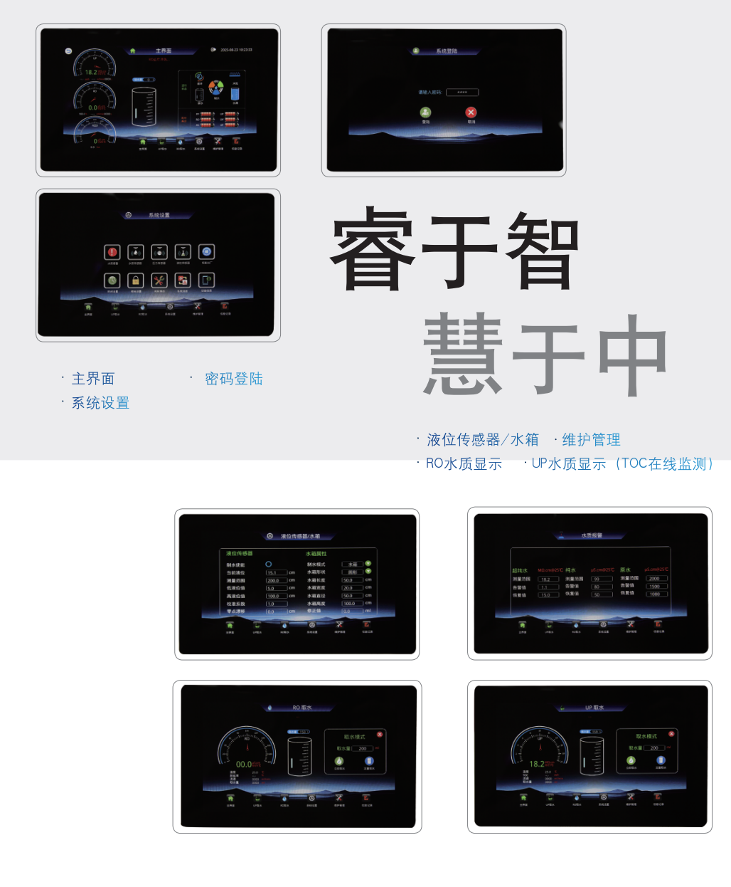 ■ 原水、RO 水、UP水三路水质及温度显示,完美实现在线监控
